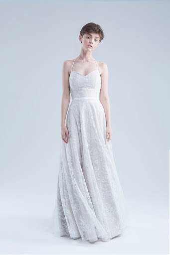 Утонченное платье из атласа и тончайшего кружева шантильи на тонких бретелях, изящно переплетенных по спинке.